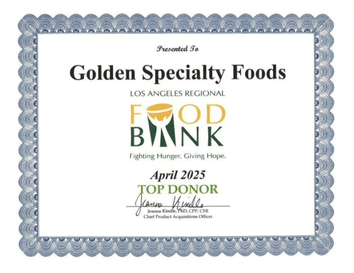 Golden Specialty Foods believes a company is only as strong as the community it services. This is why Golden Specialty Foods gives back to local charities and meaningful causes to better our community and world.